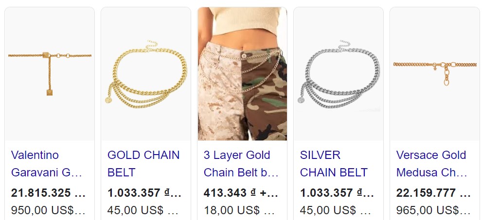 Những con số đa dạng về giá của một chiếc belly chain trong một gợi ý của Google.