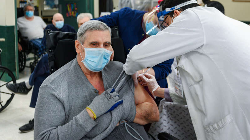a man holding a baby: James Ivaliotis receives his second vaccine dose at a longterm care facility in New York in January. The first booster shots would most likely go to nursing home residents and other vulnerable groups.© Christopher Occhicone for The New York Times James Ivaliotis receives his second vaccine dose at a longterm care facility in New York in January. The first booster shots would most likely go to nursing home residents and other vulnerable groups.