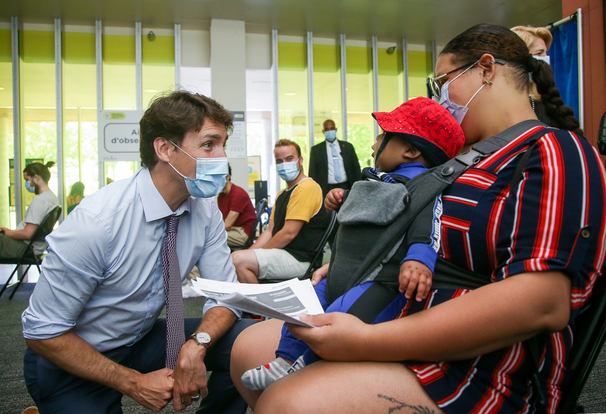 Thủ tướng Canada Justin Trudeau đến thăm một địa điểm tiêm chủng Covid-19 ở Montreal, Quebec, Canada vào ngày 15/7. Ảnh: Reuters.