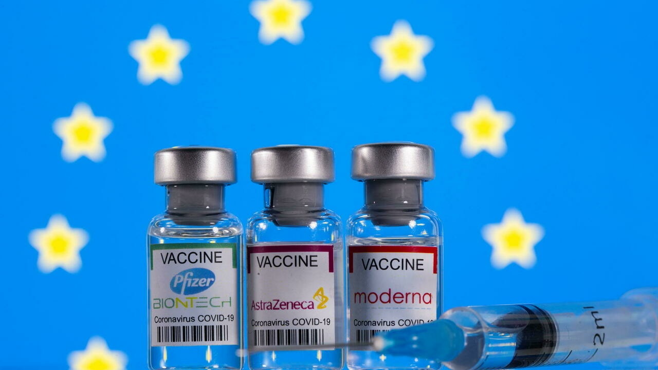 Ảnh minh họa: Ba loại vac-xin Pfizer/BioNTech, AstraZeneca và Moderna trên nền cờ Liên Hiệp Châu Âu. REUTERS - DADO RUVIC