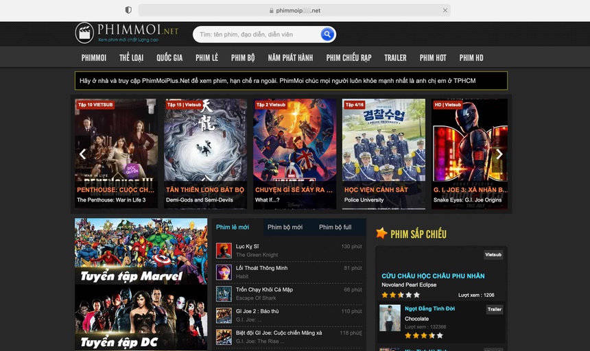Bên dưới website, đội ngũ phát triển trang web để lại thông điệp, "Chúng tôi đã trở lại với sứ mệnh mới... Hãy truy cập ngay bằng tên miền phimmoip***.net". Với những nội dung trên phimmoip***.net, đa số là phim không có bản quyền, được sao chép từ Netflix, các nền tảng xem phim trực tuyến hoặc phim chiếu rạp.