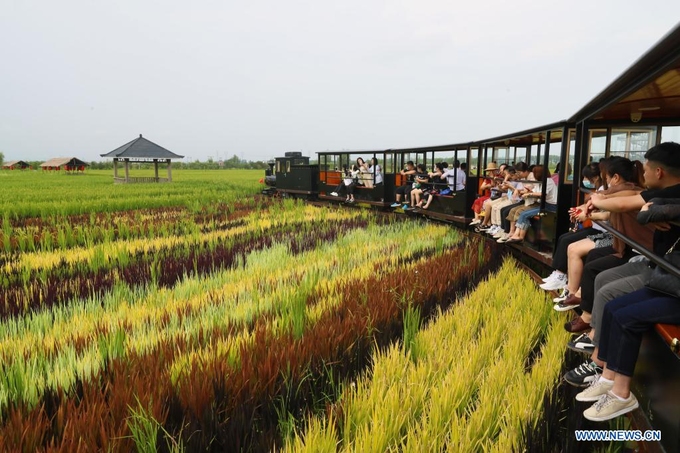 Du khách ngồi tàu, băng qua cánh đồng xanh mướt được ngắm những bức tranh tỉ mỉ, công phu bằng cách trồng đủ loại lúa nhiều màu sắc.