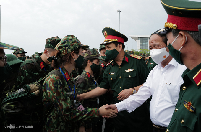 "Quân đội sử dụng tất cả lực lượng hiện có, kể cả không quân, vận tải bộ, vận tải thủy để hỗ trợ lương thực, thực phẩm và nhu yếu phẩm thiết yếu khác cho người dân, bảo đảm cách ly an toàn để phòng, chống Covid-19", Bộ trưởng Quốc phòng Phan Văn Giang phát biểu động viên lực lượng quân y tại sân bay Nội Bài, trưa 23/8.