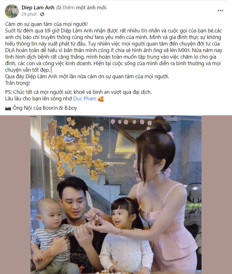 Nửa năm nay tình hình dịch bệnh rất căng thẳng, mình hoàn toàn muốn tập trung vào việc chăm lo cho gia đình, các con và công việc kinh doanh. Hiện tại cuộc sống của mình diễn ra bình thường và mọi chuyện vẫn tốt đẹp. Qua đây Diệp Lâm Anh một lần nữa cảm ơn sự quan tâm của mọi người. Trân trọng!