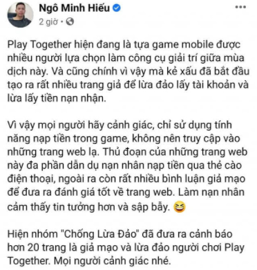 Tuy nhiên, cũng từ đây những kẻ gian đã lợi dụng sức hot của tựa game giải trí này để gài bẫy game thủ. Mới đây, Hiếu PC đã lên tiếng về vấn đề này và anh còn cho biết nhóm "Chống Lừa Đảo" của mình đã tìm thấy hơn 20 địa chỉ giả mạo lừa đảo game thủ Play Together để lừa tiền.