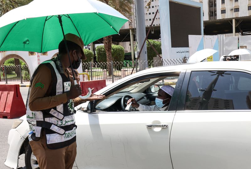 Nhân viên an ninh Ả Rập Saudi kiểm tra thông tin tiêm chủng của người hành hương tới thánh địa Mecca.