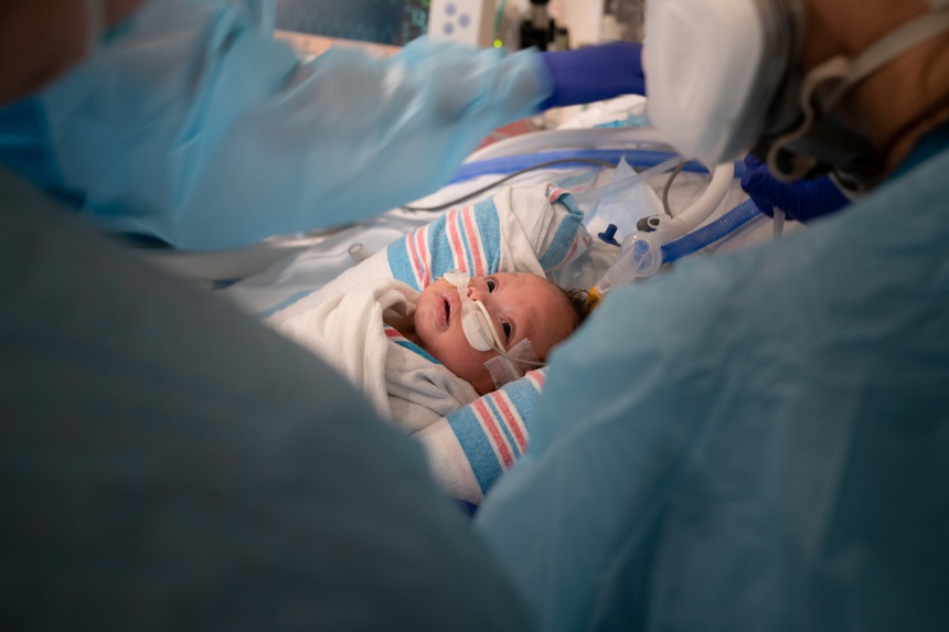 Em bé hai tháng tuổi nằm trong khu vực Chăm sóc Đặc biệt tại Bệnh viện Nhi đồng ở New Orleans vào tháng 8. Ảnh: New York Times.