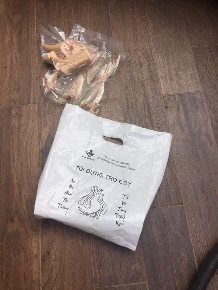 Nào ai lại đi đựng đồ ăn thức uống trên cái túi in to tướng dòng chữ "Túi đựng tro cốt" thế này không cơ chứ?