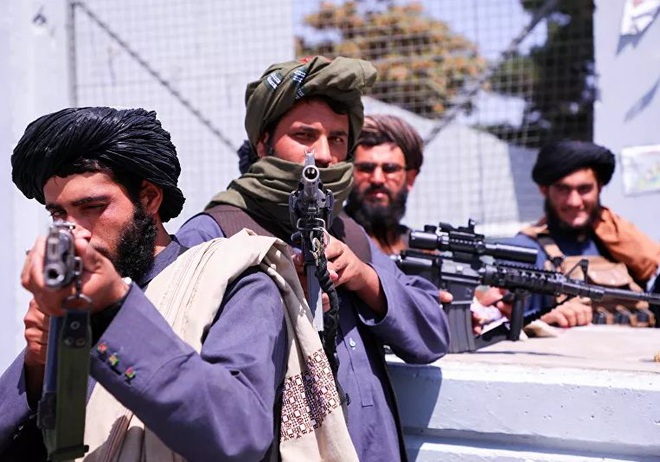 Các tay súng Taliban đứng gác bên ngoài sân bay Hamid Karzai ở Kabul (Ảnh: Reuters).