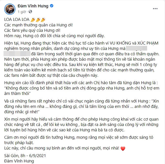 Bên cạnh đó, Đàm Vinh Hưng cũng gửi lời xin lỗi đến các nhà hảo tâm từng yêu cầu anh không công khai danh tính lúc quyên góp từ thiện: "Xin mọi người hãy hiểu và cảm thông để cho phép Hưng công khai với các cơ quan chức năng tất cả, để lôi kẻ vu khống, bịa đặt ra ánh sáng của công lý với những lời tuyên bố hùng hồn về các sao kê của Hưng mà bà ta có được".