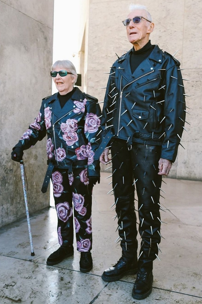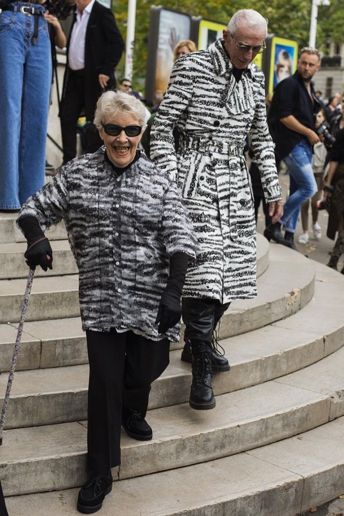 Marie-Louise (85 tuổi) và René Glémarec (86 tuổi) nắm tay nhau xuất hiện tại các tuần thời trang với đồ đôi phong cách phi giới tính.