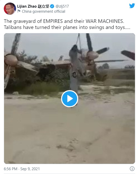 Ông Triệu viết rằng, “Afghanistan trở thành mồ chôn đế quốc và những cỗ máy bay chiến tranh”. Đoạn video quay cảnh các tay súng Taliban buộc sợi dây vào cánh của một chiếc máy bay để làm xích đu.