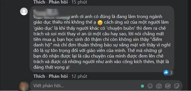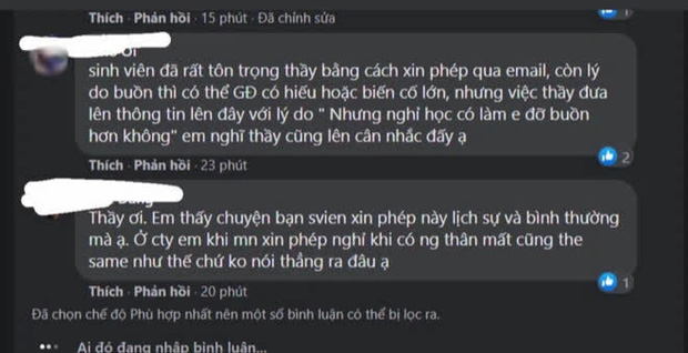 Chưa kể, với nội dung từ trong email và đoạn caption nam giảng viên đăng tải có thể thấy, dù sinh viên có quyền vắng học trong quỹ 20% thời lượng cho phép, song với thái độ rất tôn trọng giảng viên và môn học, sinh viên đã chủ động gửi đơn xin phép vắng học. Tuy nhiên, thái độ tôn trọng tương tự đến từ giảng viên lại không đến.