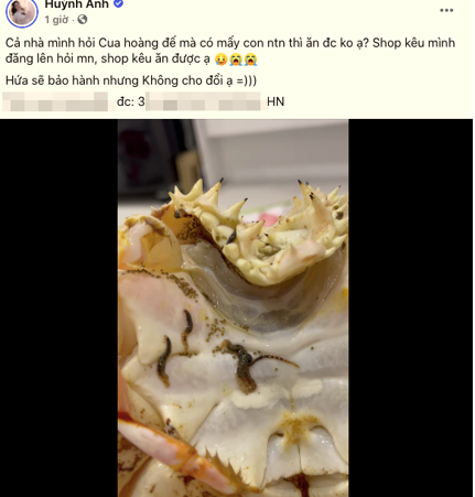 'Shop hứa sẽ bảo hành nhưng Không cho đổi ạ' - Huỳnh Anh chia sẻ thêm. Đồng thời, cô nàng cho biết cua được đặt mua ở một cửa hàng ở Hà Nội.