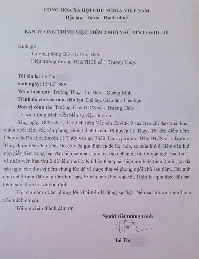 Ngày 21/9, thông tin từ Sở Y tế Quảng Bình, đơn vị này vừa có báo cáo về trường hợp giáo viên tiêm 2 mũi vắc xin Covid-19 liên tiếp xảy ra tại huyện Lệ Thủy. Nữ giáo viên này là Lê Thị L., giáo viên Trường tiểu học và THCS số 1 Trường Thủy.