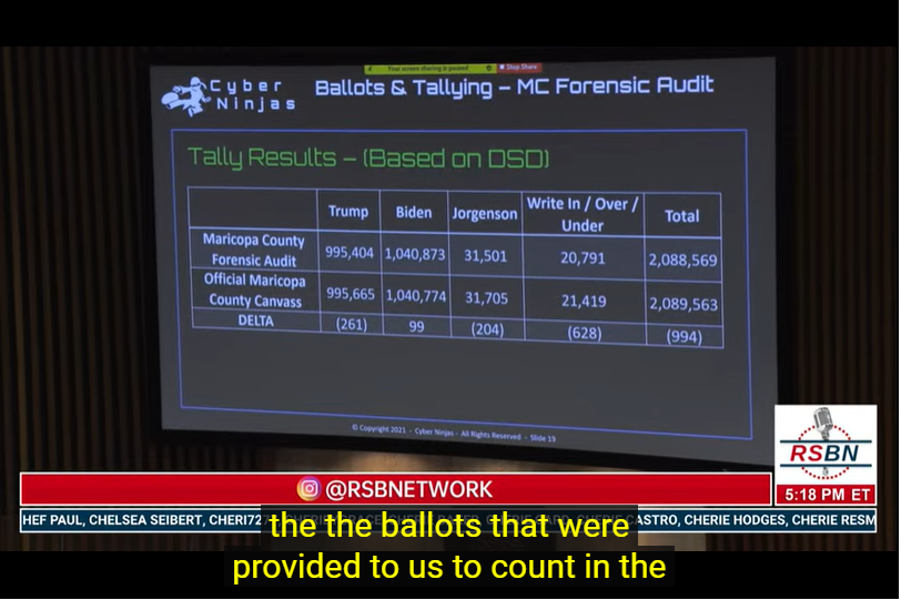 Theo báo cáo dài 110 trang, cuộc kiểm toán của Cyber Ninja thực sự phát hiện ra rằng cựu Tổng thống Donald Trump nhận được ít hơn 261 phiếu bầu so với số phiếu bầu chính thức của Quận Maricopa và tìm thấy thêm 99 phiếu bầu cho Biden.