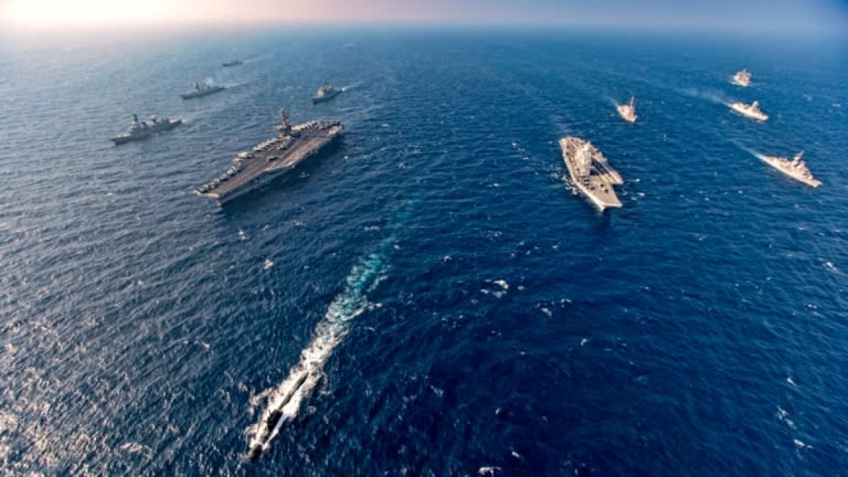 Tàu sân bay và tàu chiến tham gia tập trận chung gồm Mỹ, Nhật Bản, Ấn Độ và Australia ở Biển Bắc Arab tháng 11/2020. Ảnh: AP