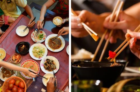 Người Việt có thói quen chấm chung một chén nước chấm, dùng đũa của mình gắp thức ăn cho người khác để tỏ sự hiếu khách. Một số người còn dùng đũa “khua khoắng” hết miếng này đến miếng khác trên đĩa chung trước khi gắp được một miếng ưng ý, rồi lại dùng chính đũa của mình gắp cho người khác.