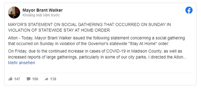 "Vào khoảng 1 giờ sáng ngày Chủ nhật (2/8/2020), tôi đã được người đứng đầu Sở Cảnh sát thành phố Alton thông báo rằng họ đang điều tra và giải tán 1 bữa tiệc ở trung tâm thành phố Alton. Tôi cũng được thông báo rằng vợ tôi cũng có mặt ở bữa tiệc bị cấm này", Thị trưởng Walker viết.