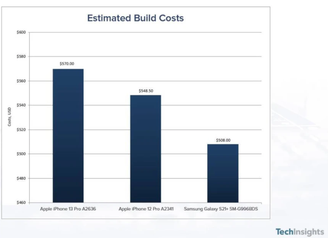 Trang TechInsights đã bóc tách các thành phần linh kiện của một chiếc iPhone 13 Pro phiên bản 256 GB và phát hiện ra rằng chi phí linh kiện của mẫu máy này cao hơn đáng kể so với mẫu iPhone 12 Pro tiền nhiệm. Thậm chí, chi phí cấu thành chiếc iPhone 13 Pro còn cao hơn đối thủ Galaxy S21 Plus.