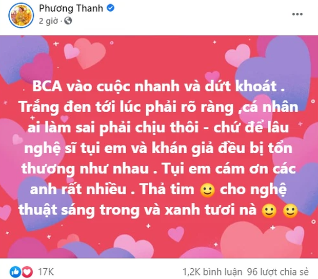 Giữa lúc sự việc ngày càng căng thẳng thì mới đây, ca sĩ Phương Thanh có dòng trạng thái gây chú ý. Theo đó, ngày 8/10, giọng ca Đêm Lao Xao viết trên trang cá nhân: "Bộ Công an vào cuộc và dứt khoát. Trắng đen tới lúc phải rõ ràng, cá nhân ai làm sai phải chịu thôi, chứ để lâu nghệ sĩ tụi em và khán giả đều bị tổn thương như nhau. Tụi em cảm ơn các anh rất nhiều. Thả tim cho nghệ thuật sáng trong và xanh tươi nè".