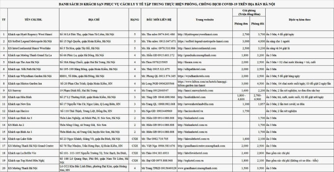 Trưa 10/10, Hà Nội công bố danh sách khách sạn và giá dịch vụ để hành khách đi máy bay từ sân bay Tân Sơn Nhất ra Nội Bài và lưu trú tại Hà Nội lựa chọn làm nơi cách ly tập trung. Đây là những cơ sở lưu trú đã có quyết định thành lập từ trước để phục vụ công tác phòng, chống dịch trên địa bàn.