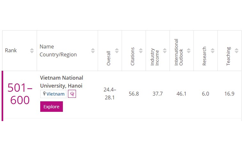 Đại học Quốc gia Hà Nội cho biết, ngày 14/10, Times Higher Education (THE) đã công bố kết quả xếp hạng theo lĩnh vực (World University Rankings by Subject) năm 2022 theo 4 lĩnh vực: Business and Economics (Kinh doanh và kinh tế), Education (Giáo dục), Law (Luật), Social Sciences (Khoa học xã hội) của các đại học trên thế giới; trong đó, lĩnh vực Social Sciences (Khoa học xã hội) của Đại học Quốc gia Hà Nội lần đầu được xếp hạng 501-600.