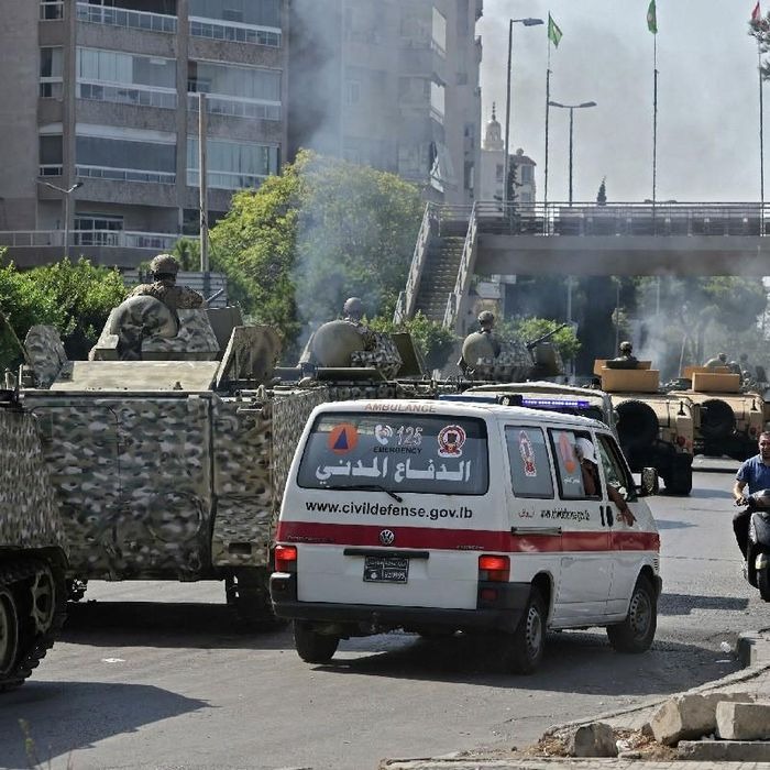 Quân đội và xe cứu thương di chuyển trên đường phố Beirut ở khu vực xảy ra vụ đấu súng hôm 14/10. (Nguồn: Sputnik)