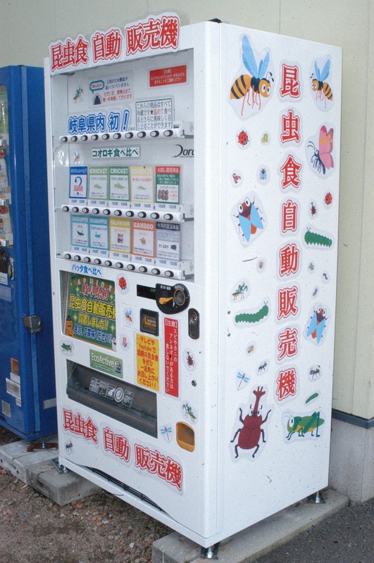 Một chiếc máy bán hàng tự động vừa được lắp đặt tại một cửa hàng ở Gifu (Nhật Bản). Điều đáng nói là nó không bán những thứ thông thường như đồ ăn, nước uống mà lại là snack ... côn trùng đủ loại. Hiện có khoảng 20 chiếc máy tương tự trên khắp Nhật Bản.