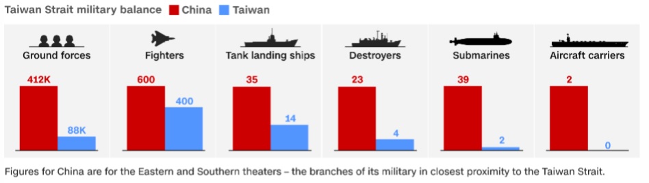 Cán cân sức mạnh quân sự hai bờ eo biển Đài Loan (chỉ tính lực lượng Trung Quốc ở Chiến khu Miền nam và Miền đông).