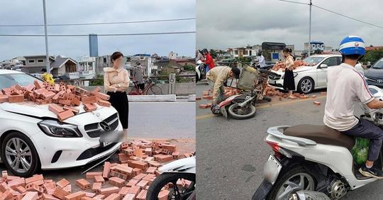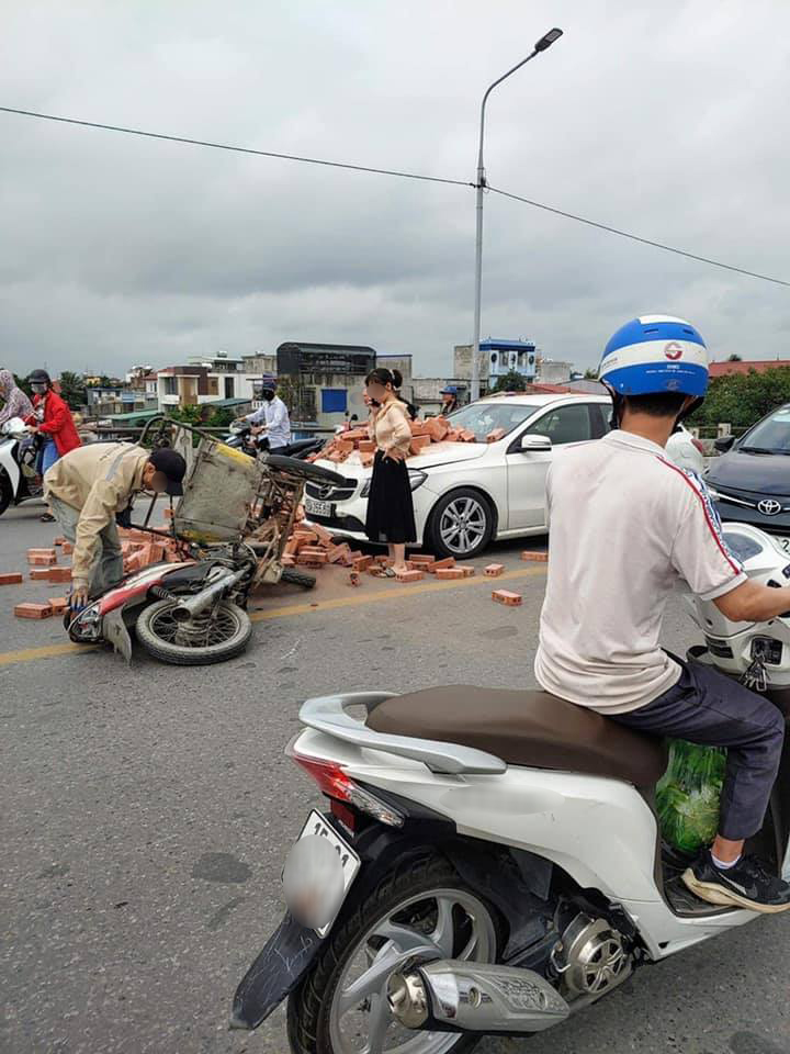 Tại hiện trường, gạch đỏ đổ lên đầu của xe hơi tạo ra cảnh tượng khá lộn xộn. Bên cạnh đó, chủ “xế hộp” và tài xế xe xích lô vẫn đang đợi để lực lượng chức năng tới để giải quyết.
