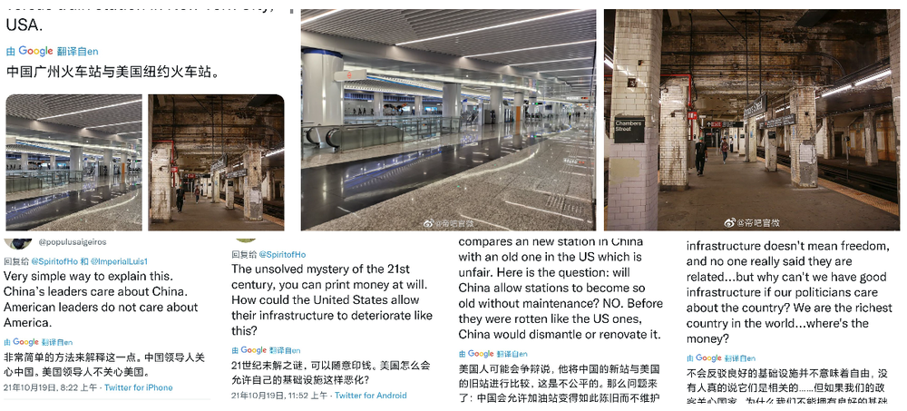 Trên nền tảng xã hội Twitter cách đây vài ngày, một số cư dân mạng đã đăng ảnh so sánh ga tàu điện ngầm ở Quảng Châu và ga tàu điện ngầm ở New York. Ga tàu điện ngầm ở Quảng Châu trông rất hiện đại và sạch sẽ, trong khi ga tàu điện ngầm ở New York đã xuống cấp và rất nhếch nhác. Những bức ảnh này đã thu hút không ít sự chú ý của cư dân mạng xứ "Cờ hoa".