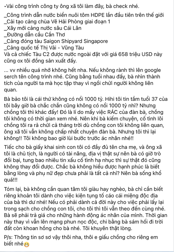 Vy Oanh đăng tải dòng trạng thái dài nói về thân thế của ông xã cũng như bày tỏ sự bức xúc của mình
