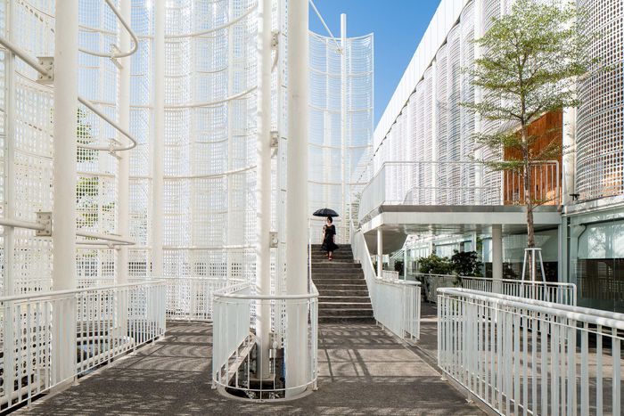 Những tấm mạng che trong mờ mỏng manh đầy cảm xúc ôm lấy các đường dạo và tạo nếp cho công trình.