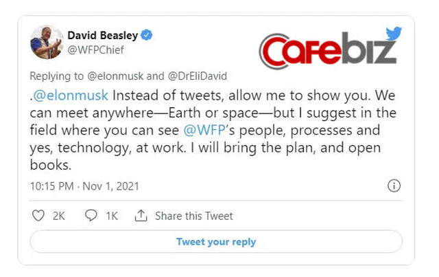 Đáng chú ý, dưới bài đăng của Elon Musk, đích thân tài khoản Twitter của ông David Beasley cũng đã trả lời: "Tôi có thể đảm bảo rằng hệ thống kế toán của chúng tôi hoàn toàn minh bạch và công khai. Phía anh có thể làm việc với Chương trình Lương thực thế giới để đảm bảo về vấn đề này".