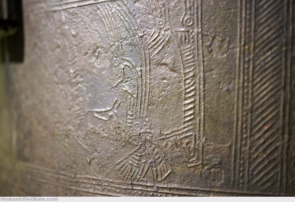 Tang trống chính là chiếc hộp cộng hưởng khuếch đại âm thanh. Phần trên có 6 vành hoa văn hình học. Vành 1 và 6: Những đường chấm nhỏ thẳng hàng. Vành 2 và 5: Văn răng cưa. Vành 3 và 4: Hoa văn vòng tròn đồng tâm chấm giữa nối với nhau bằng những tiếp tuyến song song.