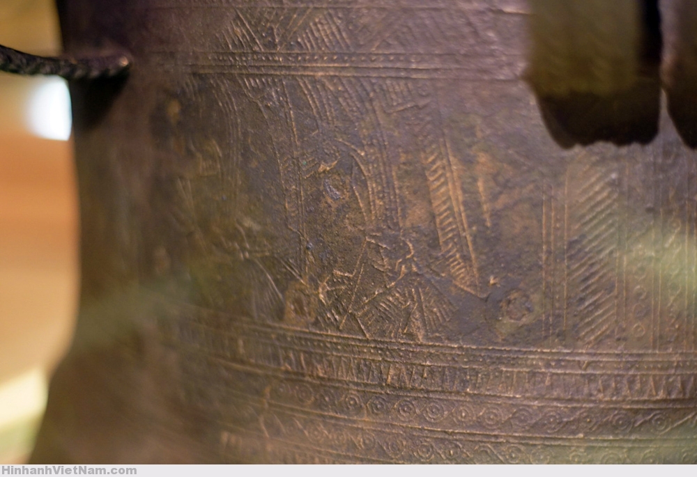 Phần dưới tang trống là 6 chiếc thuyền chuyển động từ trái sang phải, chở chiến binh tay cầm vũ khí và tù binh, xen giữa là những hình chim cò ngậm cá, chó săn được thể hiện theo lối cách điệu.