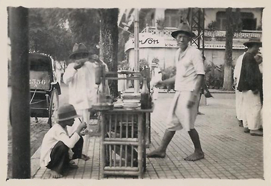 Xe bán dạo gỏi đu đủ khô bò của người Hoa trên góc đường Lê Lợi – Nguyễn Trung Trực, bên kia đường là nhà hàng Kim Sơn.