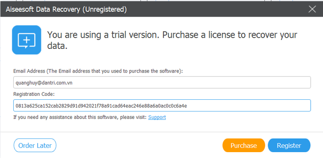 Mặc định, Aiseesoft Data Recovery cho phép sử dụng thử trong vòng 30 ngày và có giá 49,95 USD cho một năm bản quyền sử dụng hoặc 69,95 USD cho bản quyền trọn đời. Hiện tại, hãng phần mềm Aiseesoft đang có chương trình khuyến mãi, cung cấp mã bản quyền miễn phí của Aiseesoft Data Recovery hoàn toàn miễn phí.