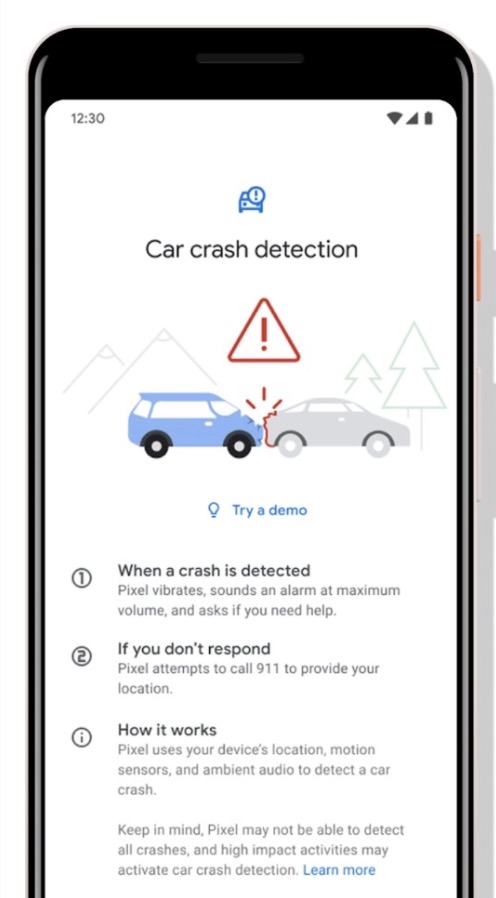 Ứng dụng An toàn cá nhân của Google trên điện thoại Pixel đă bao gồm tính năng gọi trợ giúp khi phát hiện tai nạn ô tô, giống như các dịch vụ trên một số phương tiện hiện đại, bao gồm OnStar của GM, Subaru Starlink và Fiat Chrysler Uconnect.