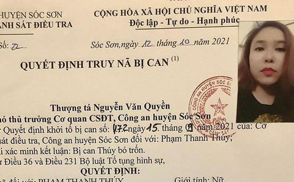 Ngày 12/10, Công an huyện Sóc Sơn đã ra quyết định truy nã bị can đối với Phạm Thanh Thúy. Đối tượng có nốt ruồi bên cánh mũi phải.