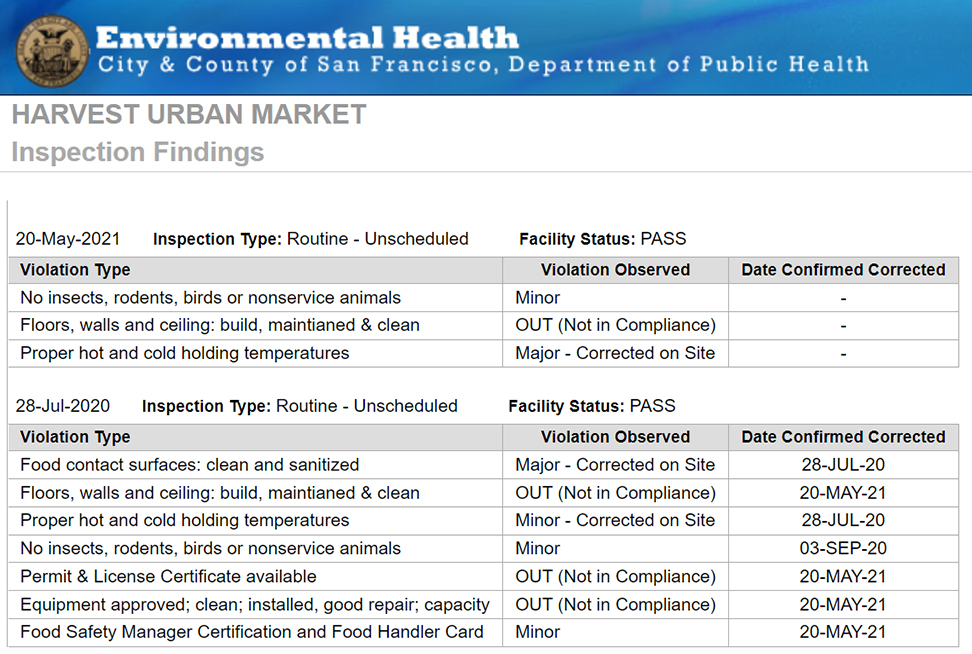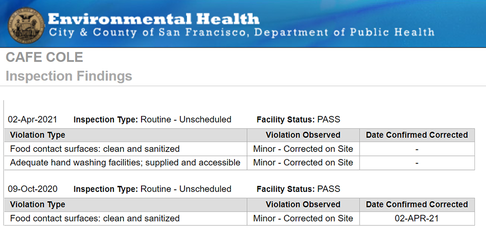 Theo trang web Environmental Health nêu chi tiết xếp hạng cho tất cả các cơ sở đã được kiểm tra ở San Francisco phục vụ các sản phẩm thực phẩm cho khách hàng. Nó hoàn toàn đáng để xem lướt qua trước khi bạn đi ăn tối. Sau khi San Francisco đã thực hiện một công việc đặc biệt trong việc kiểm tra, lập danh mục và viện dẫn các nhà hàng và cơ sở thực phẩm không đáp ứng các tiêu chuẩn vệ sinh và an toàn thực phẩm thích hợp.