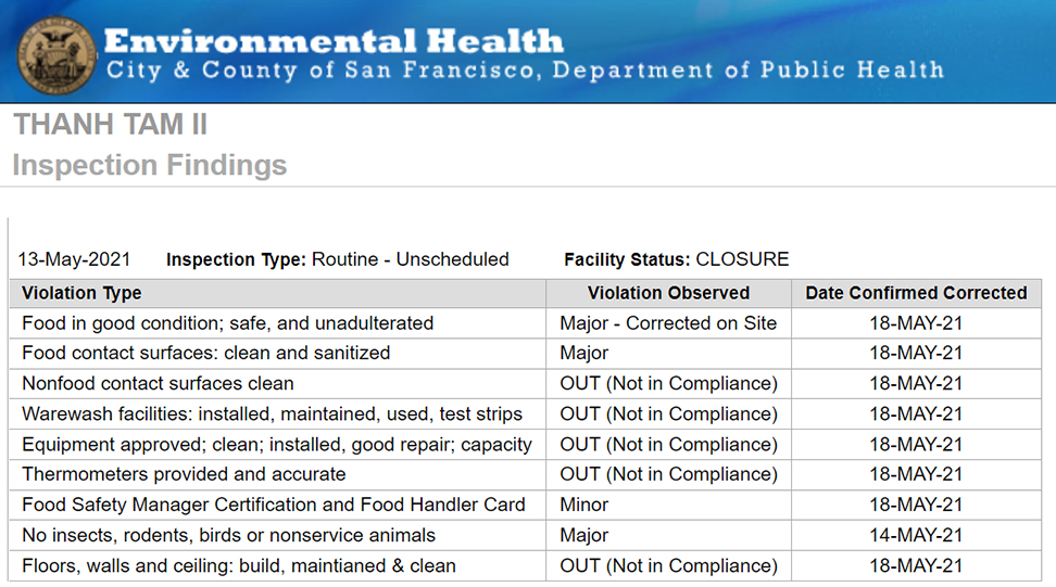 Thanh Tam II – 577 Valencia St – Nhà hàng Việt Nam này ở Quận Mission của San Francisco đã nhận được điểm số 72/100 trong chuyến kiểm tra đột xuất định kỳ gần đây nhất. Quán bị ghi nhận tay nhân viên không sạch và sử dụng găng tay không đúng cách cũng như các vi phạm khác về quy trình xử lý thực phẩm.