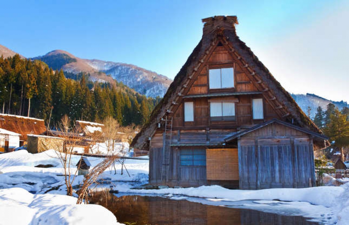 Những mái nhà lợp rạ dốc đứng giống như hình dáng bàn tay các thầy tu chắp lại để khấn Phật. Phong cách kiến trúc này được phát triển qua nhiều thế hệ và được thiết kế để ngôi nhà có thể trụ vững dưới khối lượng tuyết rơi dày đặc vào mùa đông ở vùng này.