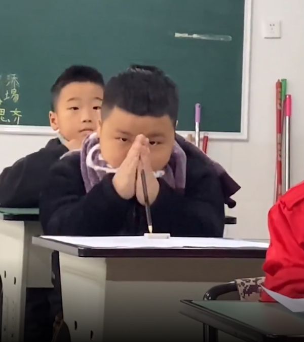 Một đoạn video ghi lại cảnh tượng nam sinh tiểu học có hành động lạ trong giờ thi được chia sẻ lên mạng xã hội khiến dân mạng dậy sóng. Trong video, khi cả lớp đang tập trung làm bài thi. Một nam sinh có hành động lạ khi cắm bút vào cục tẩy, liên tục chụm hai tay với nhau thực hiện chiêu thức kì quặc với mong muốn đạt điểm cao trong kỳ thi.