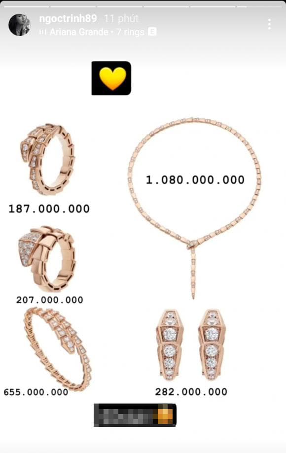 Cho đến mới đây, Ngọc Trinh lại gây xôn xao cõi mạng khi tiếp tục mạnh tay chốt đơn thêm một bộ sưu tập trang sức cực đỉnh đến từ thương hiệu đình đám của thế giới. Được biết, tổng giá trị của bộ trang sức này lên đến gần 2 tỷ rưỡi. Trong đó bao gồm đầy đủ các phụ kiện từ vòng tay, dây chuyền cho đến bông tai, nhẫn. Không chỉ vậy, bạn thân Vũ Khắc Tiệp cũng không ngần ngại tag thẳng tên thương hiệu vào bài đăng như một lời khẳng định ngầm rằng mình không hề mua hàng giả.