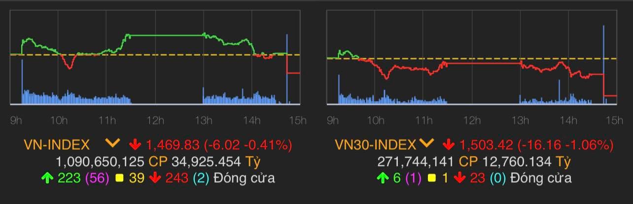 Chỉ số VN-Index giảm 6,02 điểm (0,41%) xuống 1.469,83 điểm.