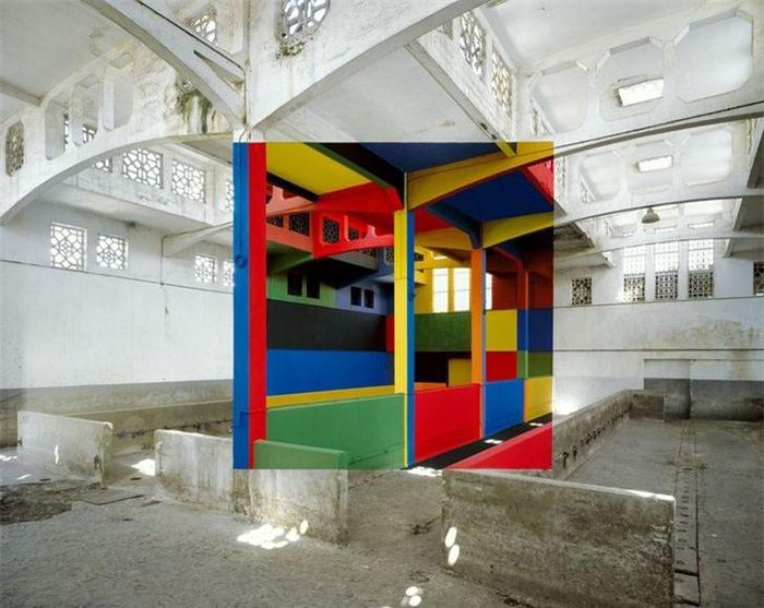 Một tác phẩm của họa sĩ người Pháp - George Rousse, người đã tạo ra những hình ảnh đầy màu sắc sặc sỡ trên nền trắng của một tòa nhà bị bỏ hoang.