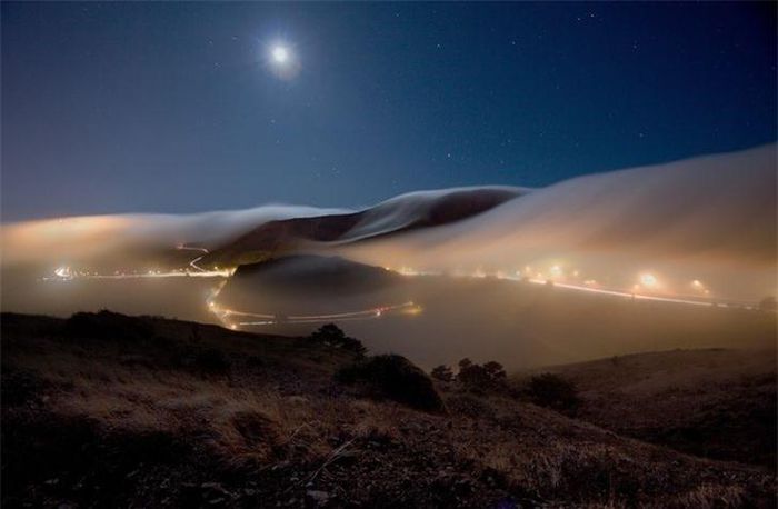 Mây mù ban đêm ở Sausalito, California, Mỹ.