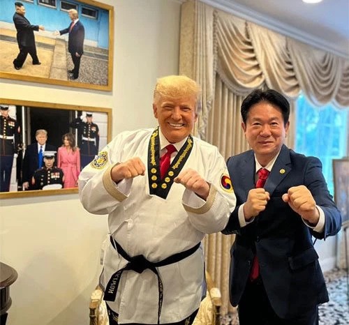 Lee Dong-seop - Chủ tịch Kukkiwon, đã có chuyến viếng thăm dinh thự Mar a Lago của ông Trump ở Palm Beach, Florida hồi cuối tuần qua. Tại đây, ông Lee Dong-seop đã trao chứng nhận cửu đẳng huyền đai - cấp đẳng cao nhất của Taekwondo thế giới, cho cựu Tổng thống Mỹ, cùng với đó là một bộ đồ võ phục Taekwondo.